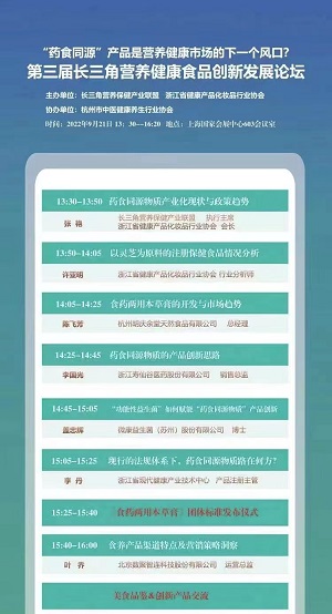 由浙江省健康產品化妝品行業協會和長三角營養保健產業聯盟聯合主辦、杭州市中醫健康養生行業協會協辦,全國各營養保健企業集體參與。于2022年9月21日下午,在會展中心603會議室召開了第三屆長三角營養健康食品創新發展論壇。主題為:“藥食同源”產品是營養健康市場的下一個風口?