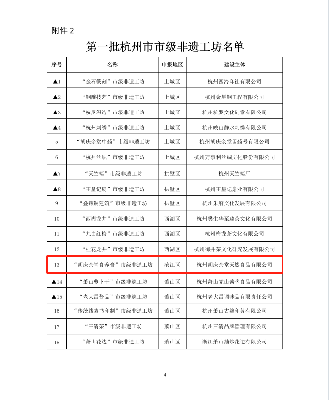 近日,杭州市文化廣電旅游局公布了第一批市級(jí)傳統(tǒng)工藝工作站、市級(jí)非遺工坊名單。經(jīng)評(píng)審公示,我司“胡慶余堂食養(yǎng)膏非遺工坊”成功入選市級(jí)第一批非遺工坊。